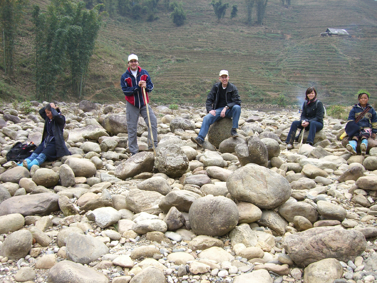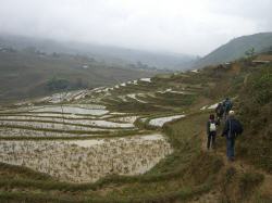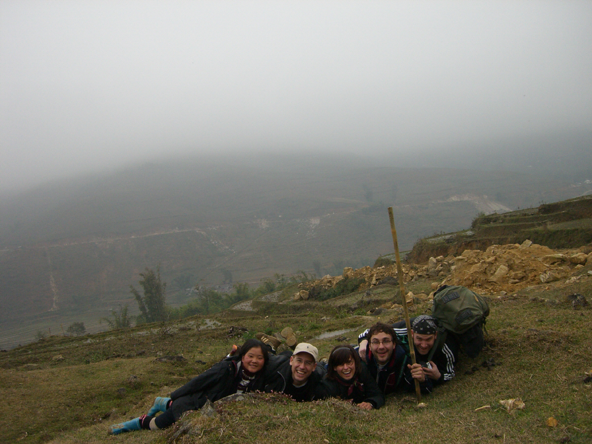 So, verdreckt und muede sind wir wieder am Ausgangspunkt angekommen. Gestern gehen wir bei Kaelte und Nebel mit Mimi (unserer Fuehrerin) los. Gleich biegen wir von der Strasse ab und kaufen uns Spazierstoecke aus Bambus, die uns angeboten werden. Weiter gehts durch Reisfelder, Matsch und Dreck und beschliessen nach dem guten Mitagessen, dass wir Mimis Elternhaus besuchen koennen, da es nur 1 Stunde Umweg ist. Herzlich werden wir aufgenommen, und obwohl die Familie von fast nichts leben muss, bekommen wir was zu essen aufgetischt und kosten eine Menge Reiswein (der Schnaps ist). Nachdem wir 1,5 Liter geleert haben und auch alle unsere Schnapsvorraete ausgetrunken haben (natuerlich mussten wir den auch kosten lassen) wandern bzw. stolpern wir weiter bis zur Huette wo wir uebernachten. Elisa faellt bzw. wird dort gleich ins Bett gefallen. Wars die Muedigkeit oder doch der Schnaps ??? Wir feiern dann noch einige Zeit weiter und bekommen ein koestliches Abendessen serviert. In der Frueh gehts sehr muede und schummrig weiter und nachdem wir ein Stueck von einem Baum kosten, kommen wir bald zur Mittagspause. Dann noch kurz weiter und wir treffen uns mit einem Jeep der uns zurueck nach Sa Pa bringt. Jetzt werden wir noch ein bisserl die Zeit vertreiben und am Abend mit dem Nachtzug nach Hanoi fahren, wos dann gleich eine Stunde nach der Ankunft weiter geht in die Halong Bucht. Ach ja, 2 Fotos hamma jetzt auch im Fotoalbum, dass alle sehen dass es uns noch immer sehr gut geht.