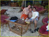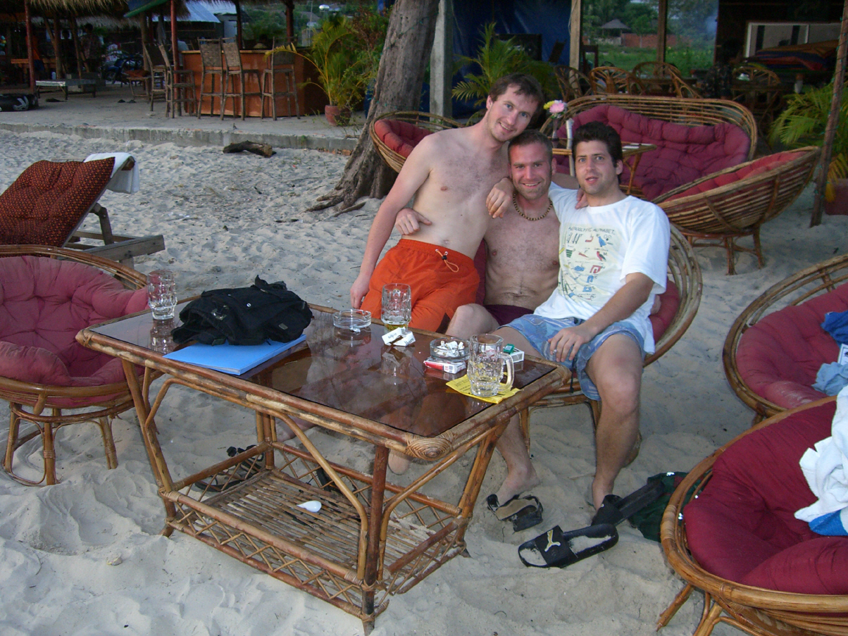 Grias eich! Wir wissen es hat lange gedauert. Aber jetzt ist es soweit mit einem kleinen Rueckblick auf die letzten Tage: Beginnen wir nochmals in Bangkok. Kurz gesagt - wir kennen diese Stadt nun wirklich als "Bangkok at night" ;-) Ok, nach einer wirklich anstrengenden ersten Nacht mit Bekanntschaften aus aller Herren/Frauen Laender schlafen wir dann doch bis 16 Uhr am naechsten Tag. Scheerly und Kosi schaffen es dann doch aus dem Bett und besichtigen den Weekend Market wo einfach alles verkauft wird, was man sich vorstellen kann - und wir meinen wirklich alles. Dann muessen wir natuerlich eine Thai Massage probieren, die einfach nur gut tut (und das zum Preis von 5 $ pro Stunde). Nach einer anstrengenden Nacht bei einer Tankstelle, die zu einer coolen Cocktailbar umfunktioniert wurde, besichtigen wir den Koenigspalast am Montag. Hierzu auch ein Foto. Dann geht es ab direkt ins Krankenhaus, wo sich Kosi und Ratschi die letzte Tollwutimpfung holen (nachdem ein Krankenblatt fuer beide erstellt wird, da alle denken wir sind von einem Hund gebissen und schon halb tot)....das gute daran - 10 $ statt 70 euro. Danach gehts in die Patpong Street, in die doch jeder Thailandreisende einmal hin muss. Wir aber spielen dort 4 Gewinnt !!! Weiters bestellen wir noch das Visum ueber eine Agentur, dass wir am Dienstag holen koennen. Nach einer sehr kurzen Nacht (die Hoteldamen waren etwas laestig, da wir um 4 Uhr Nachmittags unser Zimmer noch immer nicht geraeumt haben und doch um 12 Uhr Check out ist) staerken wir uns noch mir einer guten thailaendischen Suppe und machen uns auf Richtung Busbahnhof, wo der Bus um 22:30 schon Richtung Kambodscha wartet. Nach 4 Stunden angenehmer Fahrt kommen wir in Trat an, wo wir uns gleich einen Pick up (Ratschi will gleich das ganze Auto fuer immerhin 20 $ kaufen) fuer 9 $ zur Grenze mieten. Nach 2 Stunden an der Grenze erleben wir ein aufregendes Markterwachen und kommen gut nach Kambodscha. Dort gleich in ein Taxi, und mittels Expressboot hierher. 35 Grad Celsius - weisser Sandstrand - billiges Bier - fast geschenkte Massagen - frische Meeresfruechte - frischer Hummer - Chill out Music - traumhafter Sonnenuntergang - bleiben wir hier ????
